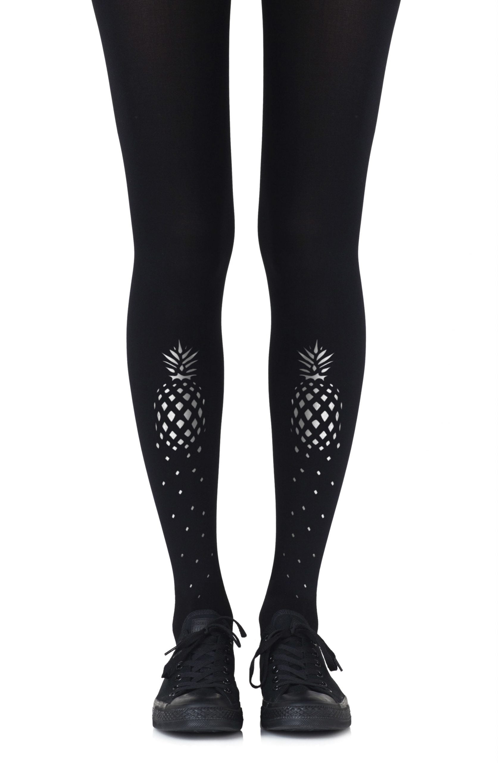 Tropical dreams in the middle of the winter? No worries! If You Like Piña Coladas will remind you of warmer places. Featuring a graphic print of the pineapple these tights are reversible. Colour: Black tights with Silver print. Thickness: 120 denier. No doubt you will shine with our metallic prints. Please note that these prints require extra care when washing and will naturally fade with wear. Unless they have X-ray vision no one will be able to see through these opaque tights. Is the party in the front or the back? You choose with reversible tights where to place all the fun. Hand print no two are the same.